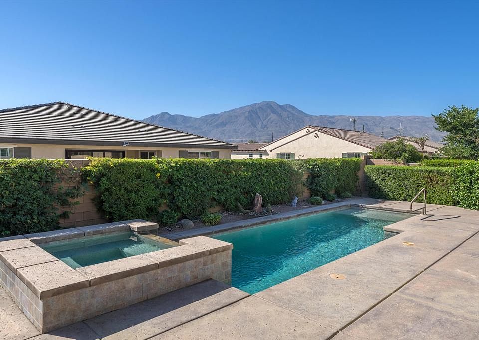 An exceptional value for this 3-bedroom, 3.5-bathroom home offering an unbeatable combination of quiet luxury, flexibility & mountain views Enjoy a pebble-finish pool and spa, high ceilings, and a great room with a fire-and-ice fireplace. The gourmet kitchen features a large prep island with bar seating, Bosch stainless steel appliances & a LG refrig. Boasting a casual living room in addition to the great room, a main suite with a sitting room or add'l office, & a dining room that could be another 'flex room' This versatile layout could be transformed into a 5-bedroom home with a few modifications, or a home with 2 offices without taking from the 3 bedrooms. The low-maintenance, beautifully landscaped yard boasts citrus and palm trees, and turf by Estate Greens. . You'll find automatic shade blinds on the patio, LED lighting, a soft water system, cabinets & work area in the garage that has its own a/c split system. The home is wired for security too. Engineered wood floors and ceramic tile throughout (except main suite closet) add style and durability. Freshly painted interior walls & garage door, & newer ac units. A portable child safety fence designed for this pool also transfers. LQ residents enjoy discounts at SilverRock Golf Course too. Don't miss out on this property!