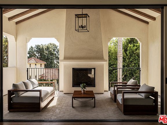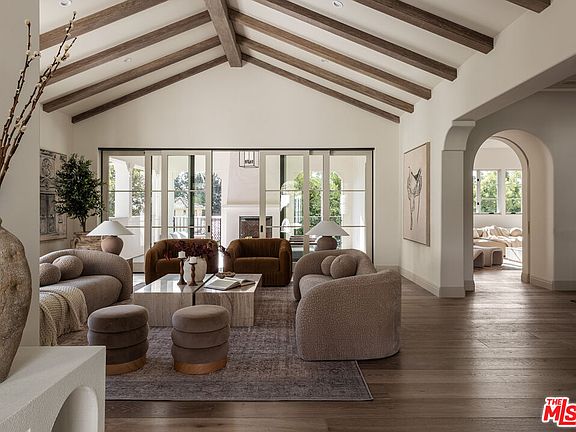 A stunning new contemporary Mediterranean estate perfectly situated in the Hollywood Hills, just moments from Sunset Boulevard and the famed Chateau Marmont. Encompassing approximately 5,800 square feet, this five bedroom, seven-bath residence blends timeless sophistication with modern luxury, highlighted by vaulted wood-beam ceilings, curated natural finishes and expansive walls of glass. The interiors flow effortlessly from elegant living spaces to serene outdoor retreats, including a covered terrace with fireplace framing lush canyon views. A gourmet kitchen featuring a La Cornue French range, Aresbescato marble countertops, and hand-worked bronze Waterworks fixtures flows into a bright breakfast nook with serene tree lined views. Each en-suite bedroom opens to a private terrace garden surrounded by lush grounds leading to a dramatic pool and spacious covered cabana. A sweeping motor court of hand-laid stone sets a dramatic tone from the moment you arrive, combining generous parking with the grandeur of a true estate approach. The detached ADU offers a private retreat with lush greenbelt views, complete with custom cabinetry, tailored finishes and abundant natural light - ideal for guests, extended stays, or creative use. Additional highlights of the main residence include a graceful spiral staircase descending to a distinctive lower-level landing area, a private home office with bespoke wood shelving, and a luxury screening room designed for an immersive cinematic experience.
