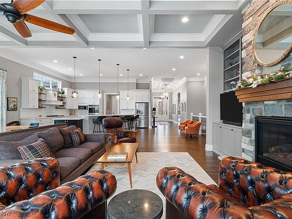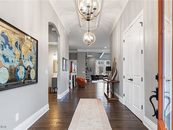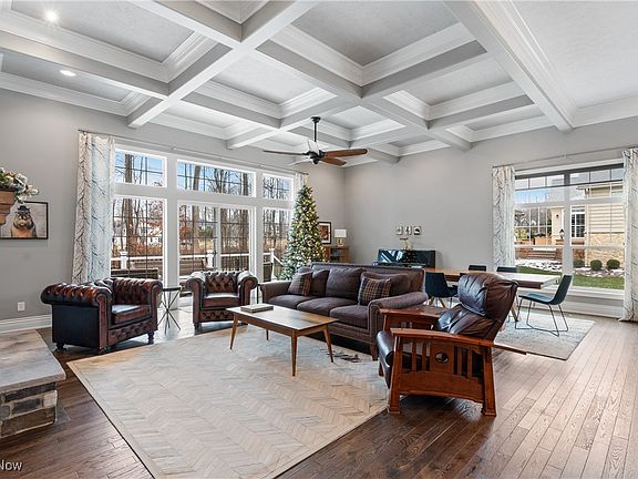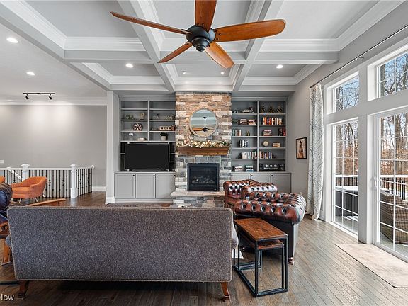 OPEN HOUSE, Sunday Dec 29th, 1-3PM! Nestled in the prestigious Canyon Lakes community, this stunning 5-bedroom, 3.5-bath ranch home is a masterpiece of modern luxury, custom-built in 2019 by the renowned Marincek Building Group. With 12-foot ceilings, impeccable craftsmanship, and designer finishes throughout, this home offers a perfect blend of elegance and functionality. Step into the grand foyer, illuminated by dual chandeliers and hardwood floors that flow seamlessly across the main level. The great room features coffered ceilings, a breathtaking floor-to-ceiling stone fireplace, and a wall of windows that frame serene views. The adjacent dining area is bathed in natural light, creating an inviting space for entertaining. The gourmet kitchen is a chef's dream, boasting white cabinets, quartz countertops, subway tile backsplash, an expansive island, high-end stainless steel appliances, under-cabinet lighting, and a nearby walk-in pantry. Also, a mudroom w/built-in storage and a stylish laundry room ensure everyday convenience. The large master suite is a true retreat, featuring double tray ceilings, two walk-in closets, and a spa-like en suite w/a soaking tub, quartz counters, and a walk-in tile shower. Two additional bedrooms on the main level share a Jack-and-Jill bath, w/a nearby guest powder room. Descend the open staircase to a lower-level oasis with 9-foot ceilings. Entertain in the spacious recreation room complete w/ a convenient kitchenette, granite countertops, and ample cabinetry. A temperature-controlled wine room, two additional bedrooms w/ egress windows, and a full bath make this space perfect for guests. Outside, enjoy the meticulously landscaped and partially fenced backyard w/additional green space. Located in a highly sought-after area, this home offers maintenance-free living w/access to nearby parks and trails. Top-rated Kenston Schools and proximity to Geauga County amenities make this property ideal for families and nature lovers alike.
