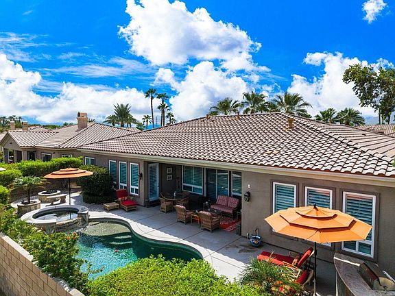 The tour begins with an enclosed ,gated courtyard complete with a custom, lighted, rain fountain in a river rock garden surrounded by lush, flowering landscaping. Upon entering this lovely home you will first notice the office with it's double doors, professionally designed and installed bookcases, cabinets and 2 desk island topped with leather granite. Next you will notice the beautiful easy-care wood floors, plantation shutters and crown molding. Beyond the foyer you will see a formal dining room with a crystal chandelier and a formal living room or conversation area. Leading to the kitchen is a full wet bar with a wine refrigerator and leather granite counter, (FYI) leather granite is more expensive and tougher than most granites plus more unique. Next is the large kitchen which offers stainless steel appliances, a walk-in pantry, high end cabinets and a large island with leather granite countertops. Beyond the kitchen area is a built-in desk, breakfast room and family room with a gas fireplace. The three bedrooms are on the opposite wing of the house and each has a customized walk-in closet and ensuite. The powder room has Italian plastered walls and a chandelier. The 3 car garage has lots of professionally installed storage cabinets, air conditioning, a Central Vac system, and a whole house water purification system. As we exit to the backyard we are greeted with Paradise!! A large covered patio, then a fabulous custom pool and spa with waterfall and fire bowls. We also see a custom flagstone fire pit and a large BBQ island and bar with a flagstone facade and granite counters. Adding to this ambiance is surround sound speakers and lush landscaping. Also there is privacy with no homes behind it and on a green belt! Finally the HOA dues are low. We invite you to experience beautiful La Quinta where there are restaurants, golf courses, tennis courts ,polo and Old Town. Call to arrange an appointment to see this lovely home before it's gone!
