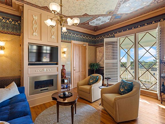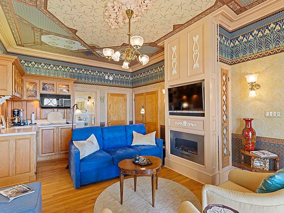 Every corner of this condo is a story, balancing nostalgia with sophistication—ideal for those who appreciate the ornate beauty of the past, re-imagined for modern living. With the comforts of modern life, this compact, thoughtfully designed space radiates warmth, elegance, and timeless appeal. The room feels grand thanks to high ceilings adorned with intricate plaster molding; Bradbury & Bradbury hand-screened wallpapers with ornate patterns; a TV and electric fireplace built into a hand-crafted floor-to-ceiling cabinet. The kitchenette marries Victorian aesthetics with modern functionality, featuring hand-crafted cabinets with glass panels. A side door, with stained glass panels, opens to the wrap-around porch and seating. This one-of-a-kind ocean-front condo is a rare gem—ideal for those who cherish historic character and artistic elegance all within a contemporary setting. The Baronet provides desirable amenities, including a beachfront-owner gathering room, coin-operated laundry, elevator, outdoor showers, communal storage for beach gear and dedicated parking space. The monthly condo fee of $441 covers water, sewer, trash removal, exterior maintenance, building insurance and this units contribution to the annual capital reserve fund. This unit is being sold furnished, excluding personal items and select artwork. While not currently a rental, it offers excellent investment potential. Units in this building rarely become available—call today for an easy showing.
