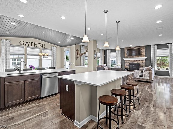 Step inside to be greeted by a world of elegance. Gleaming hardwood floors guide you through the open main level, setting the stage for effortless entertaining. A versatile home office or formal living room welcomes guests, while the heart of the home, a gourmet kitchen, is a chef's dream. Imagine culinary masterpieces coming to life on the expansive quartz island, bathed in the warm glow of designer lighting. Cozy up by the raised stone fireplace in the inviting family room, perfect for creating cherished memories with loved ones.