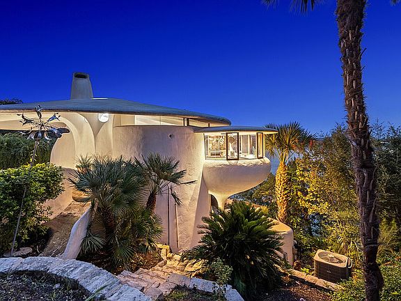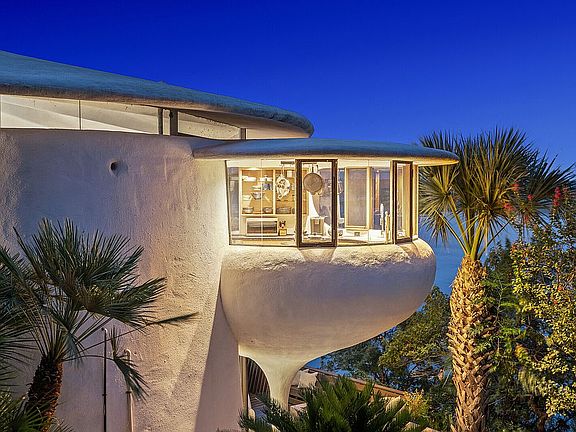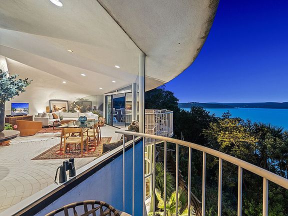 An iconic Lakeway treasure, The Sand Dollar House was completed in 1979 by John Covert Watson who studied architecture under the legendary Frank Lloyd Wright at the time he was building the Guggenheim Museum in New York. Organic modern architecture, the house is made of steel and gunite with sleek white curved walls throughout. It was designed for the artist Eugenia Hunt as a second home and has been admired for decades by all who pass by it on the lake and look up in wonder. Every room boasts commanding views of the lake through custom windows and sliding doors leading to balconies and patios that trail to the water's edge. In the Living room, a floating wood bench comes off of a curved wall and a fireplace that mimics a kiva provides a cozy conversation area. The unique round Kitchen with its mix of blue tiles and wood cabinets is suspended above a deck below. One of the home’s most interesting features is the fascinating spiral staircase with wood treads. When you look up to the tear drop shaped skylights it feels like you are inside a sand dollar. All three bedrooms are on the lower level with windows and glass doors leading out to a series of porches. A perfect home for entertaining, guests can enjoy panoramic Lake Travis views from inside the home, then spill onto the porches and decks and trail to the water.