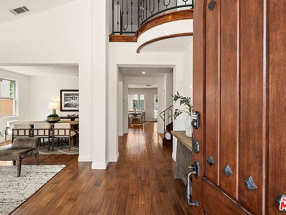 Ideally located on a tree-lined street in Miracle Mile, this two-story residence offers generous living spaces, graceful style, and a seamless indoor-outdoor flow. Built in 2005, this home combines the timeless elegance of Spanish architecture with the comfort and convenience of modern design. The front of the home is framed by lush palms and fresh landscaping, with a circular driveway offering a grand arrival. Inside, the entry foyer opens to a formal living room and dining room at the front of the home, showcasing soaring ceilings, arched windows, and rich hardwood floors. At the back, the heart of the home unfolds with a chef's kitchen, sunny breakfast nook, and expansive family room. The kitchen features an oversized island, stainless steel appliances, custom cabinetry, and abundant storage, while the breakfast area enjoys views of the resort-style backyard. The family room is anchored by a fireplace with custom built-ins, and French doors extend to a covered colonnade patio, perfect for al fresco dining and year-round entertaining. Upstairs, the primary suite serves as a private retreat, complete with its own sitting area overlooking the backyard and a built-in office featuring dual desks with custom wood cabinetry. The spacious primary bathroom offers dual vanities, a separate soaking tub, a stand-up shower, a dedicated vanity area, and a walk-in closet. Every room upstairs is light and bright, filled with windows. One of the secondary bedrooms enjoys its own private bathroom, while two additional bedrooms share a large bath, with one having direct en suite access.The backyard is a true showpiece, featuring a gorgeous deep-blue pool surrounded by lush landscaping that provides both privacy and serenity. Tall palms and mature greenery frame multiple seating and dining areas, making the space ideal for entertaining or quiet relaxation. A covered colonnade patio seamlessly connects indoor and outdoor living, while the expansive open patio provides room for lounging, dining, and gatherings under the sun. Completing the outdoor experience is a pool/guest house of approximately 488 sq ft, with its own bathroom, soaring ceilings, and sliding doors that open directly to the back patio. Whether used as a guest retreat, office, gym, or creative studio, it offers exceptional flexibility and is a perfect complement to the main residence. Additional highlights include a thoughtfully designed laundry room with custom cabinetry and a dedicated refrigerator, dual direct-access entrances to the attached two-car garage for ease and flexibility, and a long gated driveway that provides both privacy and plentiful parking for residents and guests alike. Centrally located near LA's cultural corridor of museums, shopping, and dining, this home delivers the warmth of Spanish style with the ease of modern living in one of the city's most desirable neighborhoods.