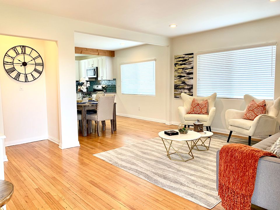 Recently renovated, open layout apartment with city skyline views, inside a naturally landscaped apartment community. Great commuting location in a central area (walk score 94, transit score 82, bike score 79), well-situated between Downtown Los Angeles, Koreatown, Echo Park, and a few miles to Hollywood. Also, only blocks from a subway station, bike route, and large public park. The peaceful backyard has a relaxing covered patio space with a fire pit for entertaining and BBQs. The apartment has central air and heat, private in-unit washer/dryer, classic hardwood flooring, and a contemporary kitchen with a stainless steel dishwasher, fridge, stove and microwave.