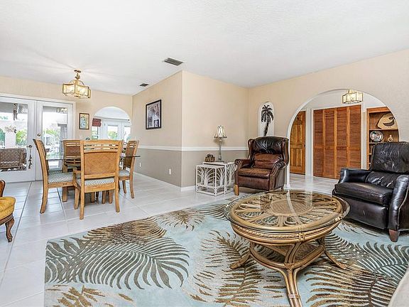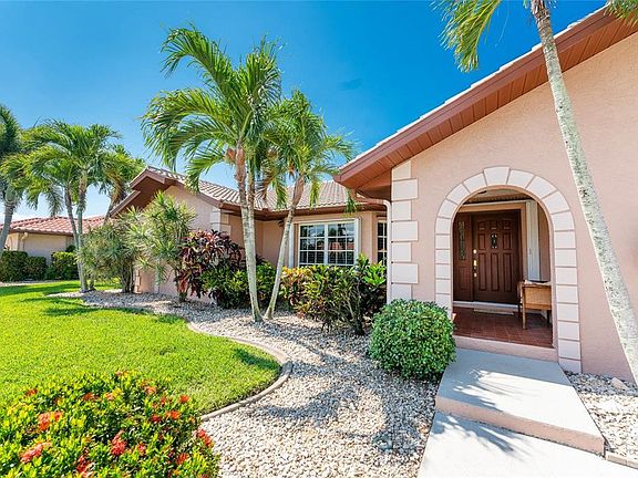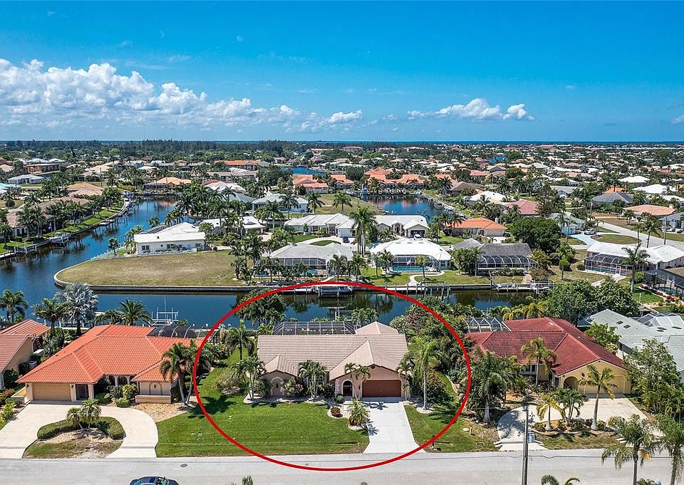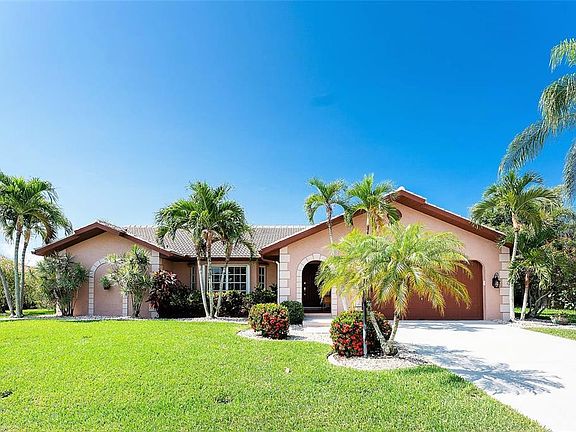 Welcome to your piece of Florida paradise! Located in the highly sought-after Punta Gorda Isles. This waterfront property is a boater's dream! Open water access in a matter of minutes. This beautifully updated home boasts 2,016 square feet of living space and features the open/split floor plan providing perfect spaces for all, including living room, dining room, family room, 3 spacious bedrooms all connected to the beautiful outdoor area that make this perfect for living out your Florida dream lifestyle. The moment you arrive at this elegant home you will begin to appreciate the upgrades from the tile roof, stunning landscaping, and soaring palm trees. Front patio entryway opens into the formal living/dining room that features beautiful tile flooring throughout living space, soaring ceilings, walls of glass sliders and doorways with water views and an abundance of space that flows effortlessly into the family room and updated kitchen. The kitchen showcases all stainless-steel appliances, granite countertops, soft close cabinetry, huge center island with seating, dinette area, and is open to a cozy family room. Large master suite with private pool access and wood vinyl flooring, opens to the master bath with a spectacular walk-in shower that includes a Rain Shower Head, extended granite counter-top vanity with his/her sinks and ample storage space. Two other good sized secondary bedrooms and separate full bath are sure to please family or visitors. Outside is an entertaining delight within an oversized pool/lanai area showcasing a sparkling solar heated pool, brick pavers and covered lanai area that keeps you shaded from the Florida sunlight. This stunning home is situated on a wide water canal with 98 of seawall in place, water/electric, and 25' concrete boat dock with 10,000 lb. boat lift. Home also features oversized 2-car garage, inside laundry room with storage space, new A/C 2022, new water heater 2021, accordion hurricane shutters and so much more. Close to I-75/US41 and nearby to Fishermen's Village, downtown Punta Gorda shops & restaurants, great boating, fishing, sailing, and more. Home is completely spotless and waiting for you. Come enjoy the Florida lifestyle in this impressive home.