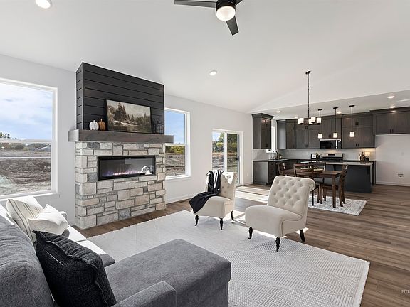 Brand New and Ready for you! Welcome to this stunning 3-bed, 2-bath home located in a desirable neighborhood. This single-level home offers a spacious layout that boosts approx. 1528 sq ft of living space. Amenities include an open-concept layout, luxury vinyl plank flooring, vaulted ceilings, an inviting fireplace in living room, & oversized windows, enhancing its modern appeal while letting natural light flow seamlessly throughout the home. The kitchen showcases, an island, granite countertops, plus a spacious pantry, & tile backsplash, for easy everyday use. The primary suite impresses with a tray ceiling, while the primary bath features a double vanity, a generous walk-in shower & walk-in closet. Enjoy the attached 2-car garage with direct entry into a stylish mudroom featuring a washer/dryer hookup & a built-in coat-and-shoe organizer for effortless everyday living. Low-maintenance siding with stucco and rock accents wraps the exterior. Newly built and thoughtfully finished, this home is moving in ready. Call to schedule your private showing today–Don’t miss out on this 100% financing opportunity! Buyers can receive $15,000 from the builder toward a brand-new home—use it for closing costs, buying down your interest rate, or adding those perfect finishing touches and accessories. To qualify, your offer just needs to be accepted before January 1, 2026.