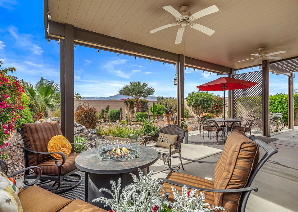 Beautifully appointed and popular Montoya plan in Sun City Shadow Hills C.C. This TURNKEY FURNISHED 2 bedroom, 2 bath PLUS DEN home (den being used as bedroom 3) features a leaded glass entry door with Invisa screen, plantation shutters, slab granite kitchen counters, stainless steel appliances, pendant lighting, custom built-in shelving in the eating area, crown moldings, tall baseboards, large diagonal tile and luxury vinyl flooring throughout. The oversized SOUTH FACING rear yard with extensive concrete decking and sidewalk has attractive low maintenance desert landscaping and plenty of room for entertaining or to add your own pool. It also features an extended solid aluminum patio cover with fans, lighting and outlets which provides ample room for lounging and taking in the great mountain views! Additional features include, recent inside & outside painting, new mirrors and lighting in the bathrooms, Tankless water heater, laundry sink, surround sound speakers, LED lighting, designer ceiling fans and loads of garage storage cabinets and hanging racks. A real gem of a find and located in Sun City Shadow Hills popular and sought after Phase 3.