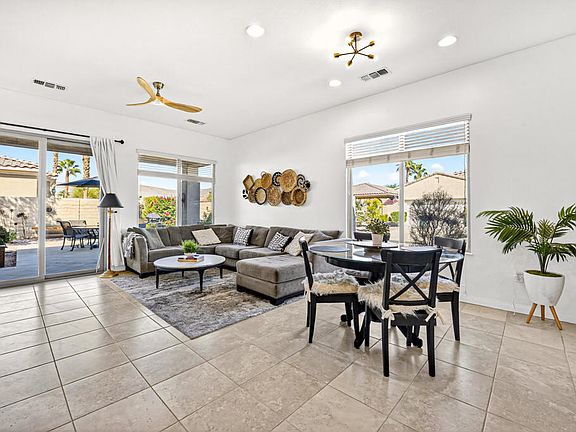 Welcome to this charming Canterra floor plan offering 1,257 sq. ft. of comfortable living space, ideally situated on a desirable corner lot in Sun City Shadow Hills. The inviting great room features tile flooring, two large windows, and a sliding glass door that fills the space with natura light and provides easy access to the backyard. The kitchen showcases sleek stainless-steel appliances, granite countertops, and abundant cabinetry with room for a cozy breakfast nook. A separate laundry room adds everyday convenience. The primary suite offers carpet flooring, a large picture window overlooking the backyard, a walk-in closet, and an en suite bathroom with dual vanities and a shower stall equipped with grab bars. The guest bedroom is located near a full bath with a shower-over-tub combination perfect for visitors. Step outside to enjoy a spaciousbackyard featuring a covered patio, firepit, extended concrete area ideal for outdoor seating, and a grassy section with a mature tree creating a relaxing retreat for entertaining or unwinding. Sun City Shadow Hills is an active 55+ community offering resort-style amenities, including two clubhouses, championship golf courses, fitness centers, pools and spas, pickleball and tennis courts, and a variety of social clubs and activities designed for every interest. Enjoy the perfect blend of recreation, relaxation, and connection in this vibrant desert community. Don't miss the opportunity to make this inviting Canterra yours!