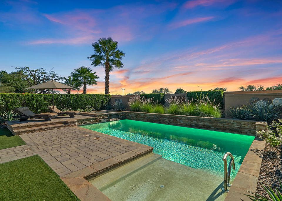 Fine finishesBreakfast barPrivate resort style oasisTanning ledgeContemporary designPaver deckingCorian countertops