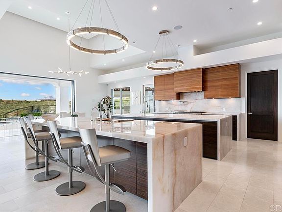 Welcome to an exceptional modern retreat situated in the exclusive guard-gated Santaluz golf community. This bespoke contemporary residence is ideally situated at the pinnacle of a tranquil cul-de-sac, providing breathtaking 180-degree vistas of the Ocean, Lake, and the expansive Golf Course landscape. Step inside to discover a meticulously crafted residence, where every detail is thoughtfully curated to evoke luxury and sophistication. From the solid Mahogany doors to the awe-inspiring chandelier, the home boasts an array of exquisite designer touches. The seamless open-concept floorplan with volume ceilings creates an inviting atmosphere, ideal for entertaining guests in the expansive Great Room and Gourmet Kitchen, complete with Onyx stone countertops, Wolf appliances, and a custom wet bar. Enhancing the indoor-outdoor living experience are motorized glass panels that effortlessly transition to a covered loggia adorned with a fireplace, offering captivating panoramic views of the surrounding landscape. Step outside to discover resort-style amenities, including a saltwater heated infinity pool and Jacuzzi, an inviting outdoor fire pit, and a pool casita equipped with a kitchen and BBQ. Retreat to the Master Suite, a sanctuary boasting a private viewing deck and an oversized bathroom suite adorned with luxurious mother-of-pearl accents. Additional property amenities include a sauna, elevator, temperature-controlled wine room, a dedicated dog and cat room with heated floors, and a home theater, where a color-changing sky ceiling sets the stage for unforgettable entertainment.