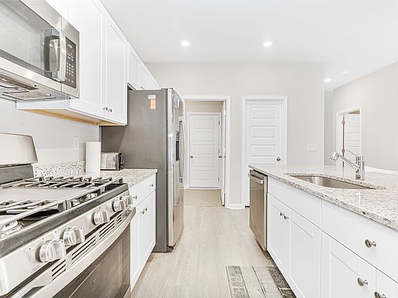The chef-inspired kitchen is designed for both style and function, featuring a gas range, top-of-the-line stainless steel appliances, including a range, dishwasher, garbage disposal, and microwave. Enjoy the convenience of solid surface countertops, a generous pantry, and a breakfast bar ideal for casual meals or entertaining guests.