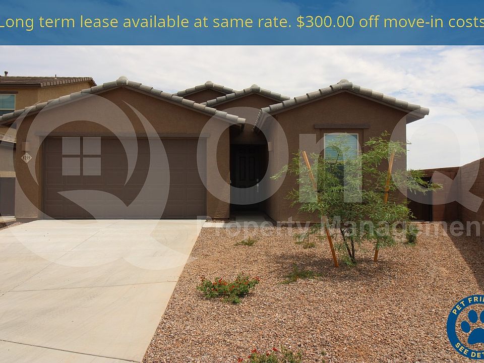 1,939 SQ FT! 5 bedroom, 3 bath home in Tucson's Rocking K Ranch! 2023 build with modern upgrades and smart home features throughout. Desirable single story floor plan! Stunning eat-in kitchen with included appliances, and expansive center island/breakfast bar. Open living/dining with sliding door patio access! Neutral interior with tile flooring throughout. This home offers 5 generously sized bedrooms! Primary suite with full bath and walk-in closet. Blinds! Enjoy a low up keep backyard with covered patio, and artificial turf! Large corner lot with no neighbors behind. 2 car garage. Rocking K Ranch offers gated entry, playgrounds, sports courts, and biking/walking trails!