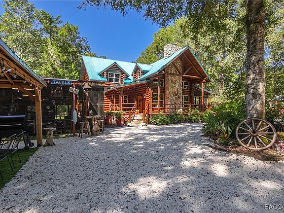 Rustic Charm Meets the Florida Nature Coast-where everyday feels like a vacation! This gorgeous Western Red Cedar log cabin sits proudly on 1.16 acres of waterfront, just minutes from the Chassahowitzka boat ramp. Step inside and fall in love with the warmth and craftsmanship—soaring ceilings, exposed beams, and a floor-to-ceiling stone wood-burning fireplace that sets the tone for cozy evenings. Designed by an architect to capture natural light and highlight the beauty of log-home living, this residence features hardwood floors throughout and was thoughtfully built on a cement slab with 40” clearance for easy access to plumbing, electrical, and ductwork. The heart of the home is the brand-new gourmet kitchen—a showstopper with double ovens, gas cooktop, granite countertops, soft-close cabinetry with custom slide-outs, under cabinet lighting, and a spacious center island. The cabinetry continues into the utility room, offering additional storage and direct access to the wraparound porch—perfect for morning coffee, evening sunsets, and year-round enjoyment. Love to entertain? You’ll be the host with the most thanks to firepit seating area and a 22x30 screened outdoor kitchen equipped with a stove, large TV, and refrigerator. Overnight guests? No problem—your RV port fits two units with full hookups, while two 22x24 fully insulated storage buildings provide power, lighting, and ventilation—ideal for workshops, hobbies, or extra storage. With a covered boat dock, you can fish, kayak, or simply relax and soak in the peaceful surroundings. From peaceful mornings by the water to evenings around the fire, this one-of-a-kind retreat blends rustic elegance, modern upgrades, and true Florida outdoor living. Great opportunity for an Airbnb for those looking for something unique. Homes like this are rarely offered—don’t miss your chance to own a piece of paradise!