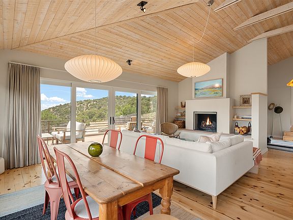 A truly one-of-a-kind mountain retreat tucked into La Barbaria Canyon’s ponderosa pines and capturing extraordinary picturesque foothill and sunset views. The thoughtful layout maximizes the interplay between interior and exterior spaces, fostering a sense of oneness with the natural surroundings. Light fills the open-concept living area showcasing the wood-burning fireplace and expansive glass doors which lead to the recently re-built view deck. Newer stainless steel appliances and a cozy breakfast nook with built-in banco seating are highlights of the charming kitchen. Three bedrooms, plus a lower level gym or office with half bath and separate entrance, enjoy nice separation and provide flexibility of use. The serene primary suite includes ample closet space, a kiva fireplace, and a private patio with a custom, high-end Finnish sauna. Authentic details and modern amenities abound in this upgraded and improved home, including wide-plank pine floors, stylish lighting, whole-house water filtration, and energy-efficient solar power. Coveted location off the historic Old Santa Fe Trail with access to hiking trails and convenient to all parts of town. Please note: An adjacent 5.0 acre lot is separately available for purchase.