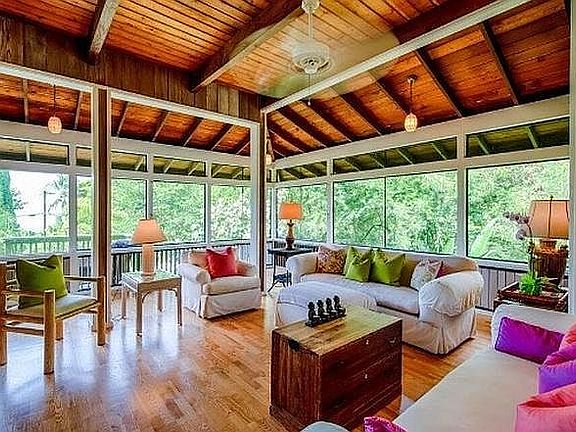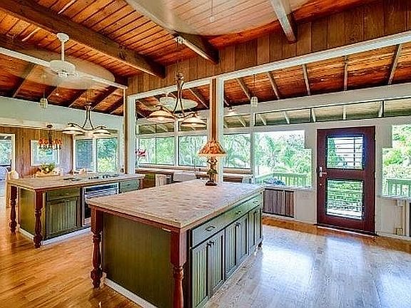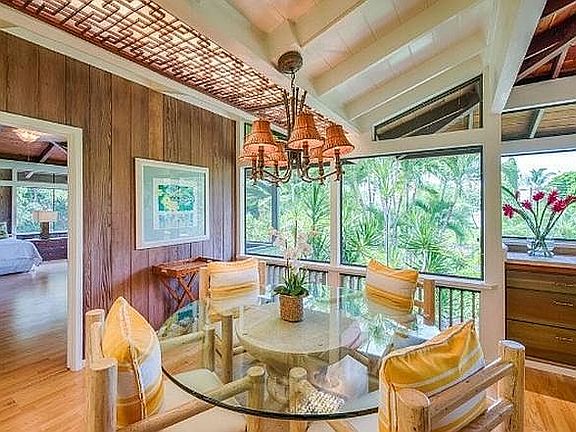 Pagoda House's layout makes it the perfect vacation home for extended family - it has two ocean-facing master bedrooms each with their own ensuite bathroom, and two additional garden-view bedrooms that share a bathroom. The upstairs master bedroom, bath and private sitting area cover the entire top floor of the home and it has stunning ocean and cliff views. The upstairs master shower overlooks the backyard and a giant monkeypod tree. The home is entirely surrounded by a large, mature and beautifully-manicured tropical garden. Depending on the season, fresh starfruit, mango, passionfruit or bananas hang from the vines and trees. There is plenty of parking in the carport and plenty of storage for kayaks, surfboards and more in a storeroom adjacent to the carport.