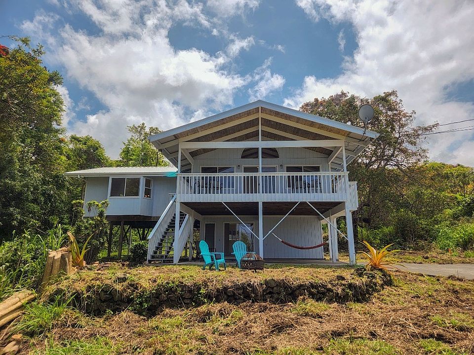 Nice ocean and sunset views from this large home with a flexible layout and large open space underneath inviting a future build-out. Many large windows showcase the lush green foliage surrounding the home. There is a beautiful vaulted wood ceiling in the great room, which leads out to the covered lanai with ocean and sunset views. New roof and gutters - April 2022 New catchment liner, pump, pressure tank, filters and UV light - April 2022. Everything your water supply touches is brand new! Just surveyed- all corner pins in place - April 2022 This lush one acre property has good soil for your future garden. Shady paths meander through the trees. There are also many established plants: Macnut Avocado - a couple of these huge avocado trees are begging to become your new treehouse! Orange Banana Coffee Mulang Guava You'll likely uncover even more fun plants as you tame back some of the overgrowth! *Listing agent is owner