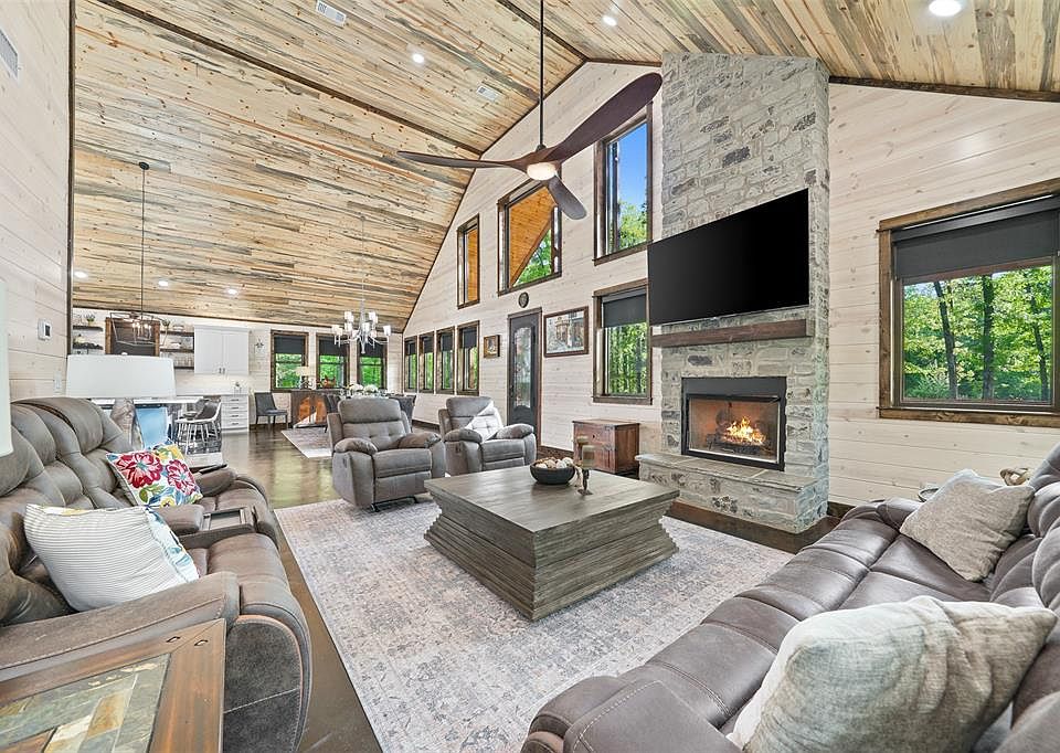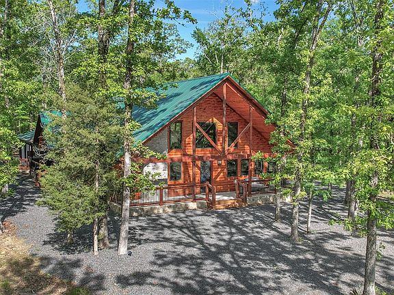 The Mystic River Retreat, a serene escape nestled amidst nature's embrace is a newly built one & a half story cabin carefully designed with two-story ceilings, rustic-modern design, & walls of windows. A 5BR & 4BA luxury cabin has an EXPANSIVE outdoor deck, lounge chairs & 7-person jacuzzi alongside a running creek & is located in the heart of Hochatown near Broken Bow's most popular attractions. Mystic River boasts 3,700 SF of perfectly designed suites for privacy and a 2500 SF of covered patio with full dining, living areas & dedicated space for lounging. Inside, the Custom Kitchen has an organizational system for an ultimate cooking and entertaining experiences. The oversized island is great for preparing meals together. On the first floor, two luxurious suites await, ea with Smart TVs, king or queen-sized bed, & ensuites offering a retreat-like experience. A third bedroom, bathed in natural light from expansive windows overlooking the surrounding forest features two queen-sized beds. A conveniently located hall bath stands ready to accommodate with a private sink, toilet & shower. The Primary Suite has a private patio leading to the outdoor amenities & its ensuite bathroom is designed for the ultimate luxury experience with an oversized shower, (4) body sprays & a TOTO toilet with a Bidet. Custom his & her vanities with LED framed mirrors provide space for getting ready. The second floor includes an inviting cozy lounge area where you can unwind & reconnect. Two additional bedrooms, complete with queen-sized beds & Smart TVs, offer a peaceful sanctuary for rest & relaxation. A full bathroom serves these rooms, ensuring comfort & privacy for all guests. Indulge in ultimate relaxation in the jacuzzi, where up to seven guests can enjoy the soothing massage jets. Hammocks sway gently in the breeze, inviting you to unwind amidst the sounds of nature, lounge chairs on deck & a large fire pit, surrounded by 12 Adirondack chairs finish off the outdoor experience!