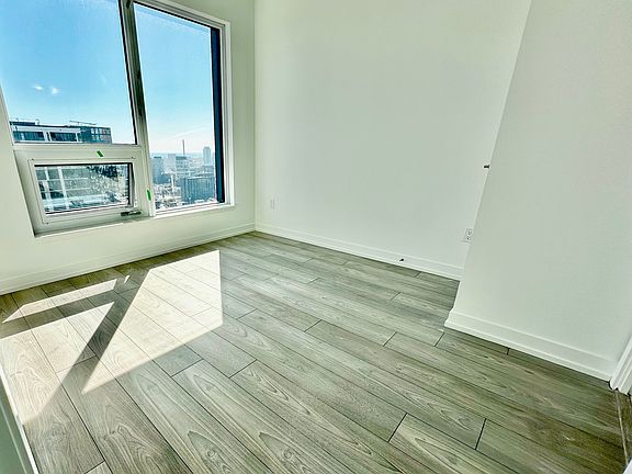 Sleek laminate flooringLarge windowsHigh ceilingsModern kitchenBuilt-in appliances