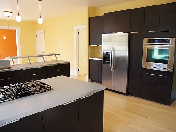 Enjoy an open-concept layout with beautiful hardwood floors and large windows that fill the space with natural light. The modern kitchen features sleek dark cabinetry, stainless steel appliances, and plenty of counter space ideal for both everyday cooking and entertaining.