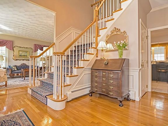 Stately hip-roof colonial residing on "the" premier lot in sought-after cul-de-sac abutting Rocky Woods! Pride of ownership is evident as you approach the manicured grounds and enter this meticulously maintained, well-appointed home.The classic design features open, spacious rooms on 3 levels w/a walk-up attic for potential expansion. The sun-filled 2-story family room is spectacular, accented w/a custom "Dodd" fireplace mantle, built-in media wall, bookcase & back staircase.The kitchen offers a large island w/ample cabinets, granite counters, cooktop, double ovens, wet bar, walk-in pantry & desk adj to the mudroom, w/a breakfast bay leading to the composite deck & screened porch affording views of the yard w/its magnificent evergreen hedge. Fine details such as mahogany inlaid floors, french doors, bay windows & distinctive millwork accent the open living/dining room & office. Spacious bedrooms w/ample closet space, 2nd fl laundry & an expansive finished lower level make this the one!