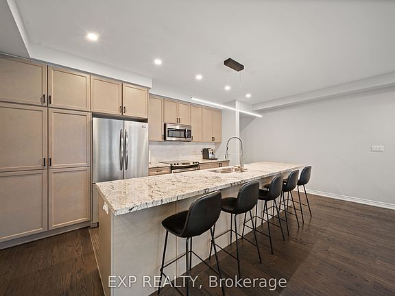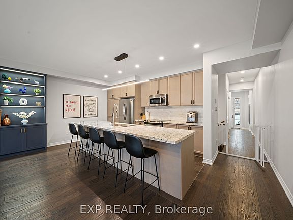 Welcome to this stunning townhouse located in the highly sought-after Aurora Trails community. This beautifully upgraded home features an open-concept design with smooth ceilings, pot lights, and hand-crafted hardwood throughout. The living area is anchored by a gorgeous fireplace surrounded by a built-in bookshelf. Spacious modern kitchen complete with granite countertops and large family sized island. Enjoy 9 ft. ceilings on both the main and second floors. The home also includes a convenient second-floor laundry updated in 2021 and a fully finished basement renovated in 2023, perfect for additional living or entertainment space. The fenced backyard offers a patio, gas hookup for bbq and a shed set on a concrete base. The luxurious primary ensuite features a free-standing tub and a glass-enclosed shower. With countless upgrades throughout, this home is truly a must-see!