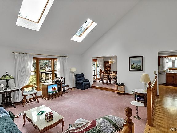 Wonderful 3-bedroom, 2 full bath ranch in prime Amherst location! Spectacular open floor plan! Spacious family room with volume ceiling and skylights opens to formal dining room and eat in kitchen! 1st floor laundry. Oversized primary en suite with full bathroom. Maintenance free vinyl exterior and concrete driveway. Expansive rear deck overlooking deep private yard!
