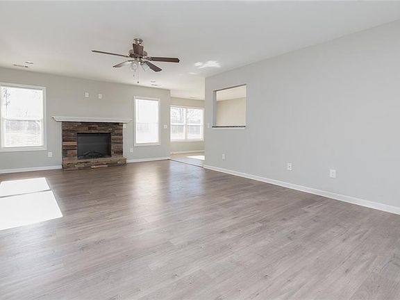 Stacked stone fireplaceWalk-in closetSs appliancesSeparate showerWhite cabinetsGranite kitchenMaster suite
