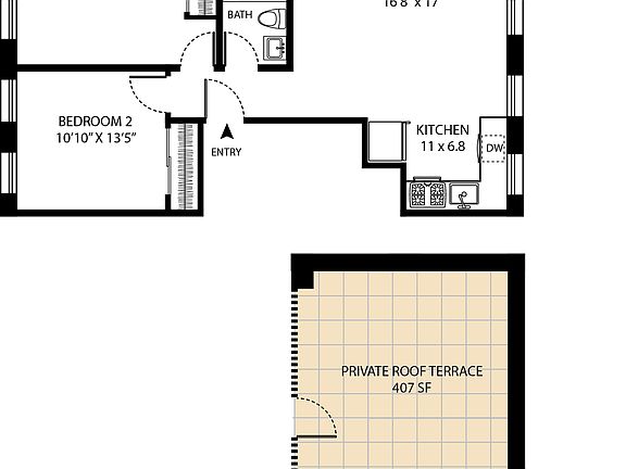 Top floor 2 Bedroom, one and a half bathroom with HUGE 400+ square foot PRIVATE roof deck. The apartment is the entire fourth floor of a 4 story building with Northern and Southern exposures. The living room is spacious and with 5 windows providing excellent light. The open kitchen offers granite countertops with plenty of cabinet space, stainless steel appliances including a dishwasher and stove that vents to the outside of the building. Both bedrooms are generous sizes and offer oversized closets, 9' ceilings and two windows each. The roof terrace offers unobstructed views of the NYC skyline and East River. A perfect setting for Summer BBQs and dinners. Building features include an intercom system, laundry room and bike room.. Close to all boutiques, restaurants, bars and art galleries, the Greenpoint Avenue G-Train and the East River Ferry