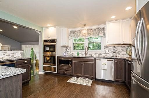 Welcome Home to this beautiful recently renovated custom Cape Style home. A true gem with loads of character and charm. If you like to entertain and cook, you will love the spacious open concept gourmet kitchen with mosaic backsplash, granite countertops and stainless-steel appliances. Oh, and did we mention the extra touches such as the pot filler, warming drawer, double wall ovens and beverage refrigerator. The elegant dining room offers built in cabinets, crystal chandelier and fireplace. Additional touches include the recessed lights, gleaming hardwood floors and central air. Dont forget about the bathrooms that give that spa like vibe. Master Bedroom with his and her closets. A finished lower level leads to a cozy deck overlooking the large lot and firepit area. This home has been completely updated from the studs including the electrical, insulation, windows, kitchen, bathrooms, and lower level. This home is a must see, you will fall in love with all the finishing touches!