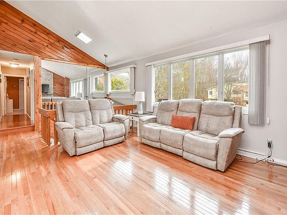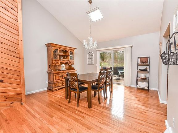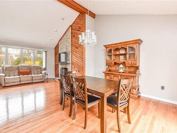 Discover rustic charm in this raised ranch-style home nestled on a wooded one-third-acre lot, offering privacy and tranquility. With three large bedrooms and two fully renovated bathrooms, this home provides ample space for comfortable living. The main floor boasts an open floor plan with vaulted ceilings and a striking brick fireplace, creating a cozy ambiance. Downstairs, enjoy additional living space, a wood stove for warmth, and a convenient laundry area. The attached one-car garage features a workshop, perfect for tinkering or storage. Step outside to the deck through the sliding glass door and soak in the peaceful surroundings of your wooded backyard.