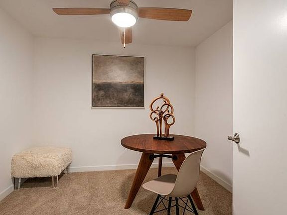 White wall paintSleek mecho window shadesSleek wood plank flooringPlush carpetDark gray quartz countertopsStainless steel appliances