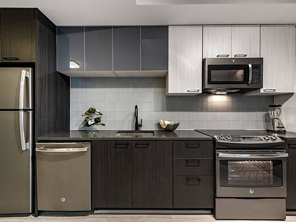 Our apartment homes at Ore 82 include white wall paint throughout with modern three tone kitchen cabinets with dark gray quartz countertops and Stainless Steel appliances. Enjoy sleek wood plank flooring in your kitchen and living area(s) with plush carpet in your bedroom(s) and den with tile in bathroom(s), and sleek mecho window shades.