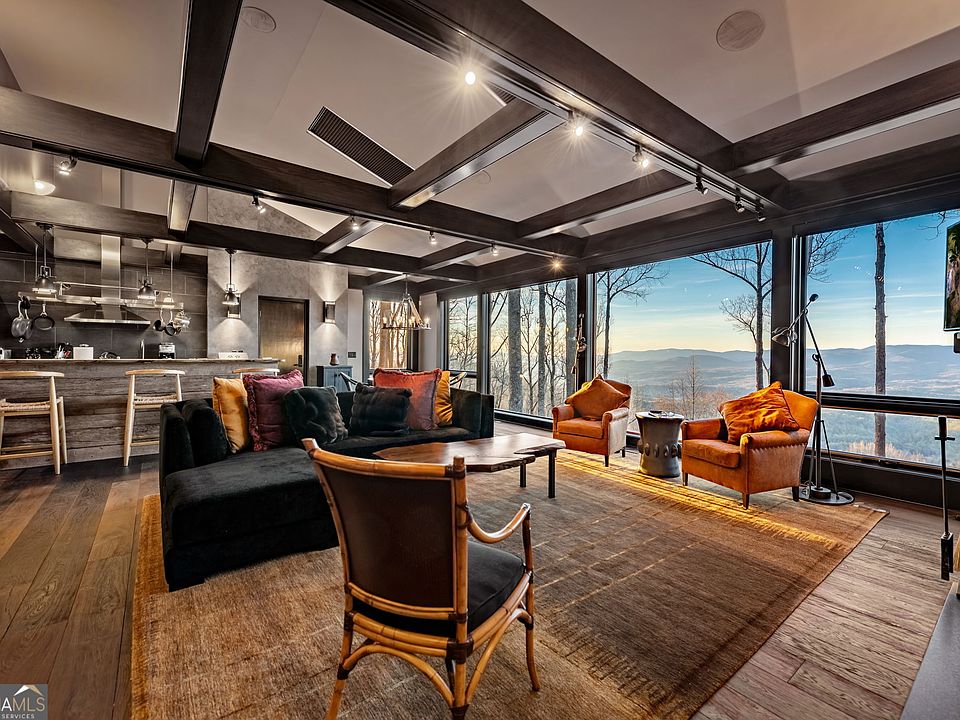 Welcome to an extraordinary luxury retreat, elegantly nestled in the breathtaking North Georgia mountains. This custom-designed home, meticulously crafted in collaboration with a renowned architect, artfully combines rustic charm with refined elegance, creating a serene sanctuary immersed in nature. Accessed via a private gated drive, the residence encompasses five expansive "top of the mountain" lots, offering 2.6 acres (5 total lots) of unparalleled privacy and stunning vistas. Upon entering, you are welcomed into an upscale haven where sophistication harmonizes with coziness. Bright and airy living spaces are enhanced by floor-to-ceiling glass panels that frame captivating mountain views and create an inviting ambiance, complemented by intimate ceiling heights. The chef's kitchen serves as the heart of the home, equipped with upscale appliances and unique quartz countertops, perfect for culinary exploration and entertaining. Additional conveniences include a touchless kitchen faucet, a dedicated vacuum for fireplaces, and integrated porch speakers. Dining becomes effortless with table extensions accommodating up to 12 guests-ideal for memorable family gatherings. The expansive primary suite features an elegant fireplace and a spa-like master bath that includes a tile shower, soaking tub, and luxurious countertops. Guest accommodations upstairs provide privacy and comfort, each featuring its own private water room and sink. A convenient carport offers sheltered parking, adding a touch of practicality to this elegant residence. This exquisite home presents a unique investment opportunity; its elegant design and high-end features position it as a standout rental property in the area while also serving as an exclusive escape from the bustle of daily life. Moments from Ellijay and Blue Ridge, this sanctuary captures mountain living with easy access to hiking and waterfalls. Experience luxury and nature's serenity-your ultimate mountain escape awaits.