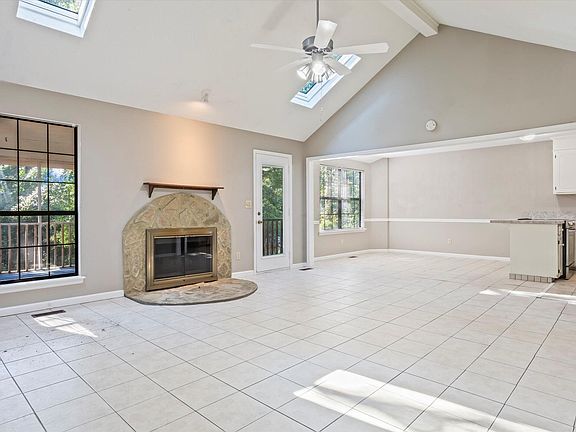 The living room is highlighted by a vaulted ceiling, brand-new skylights, tile flooring, and a gas fireplace. The floor plan is open to the dining area and kitchen. The kitchen is equipped with an updated stainless steel glass top oven and refrigerator, Whirlpool dishwasher, and tile flooring throughout the main living areas.
