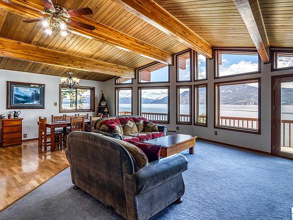 Few places on Earth compare with the mountain & open water views this property has to offer. Nestled on a private beach away from the crowds, this inviting home on the sunny side of Lake Pend Oreille is just 13 miles from downtown Sandpoint. Twelve-foot-high beamed ceilings on the main floor provide the ultimate in open concept living. Tongue & groove cedar, accented with a river rock fireplace & pellet stove provide an intimate, welcoming atmosphere. Large windows flood the space with natural light & you can actually see the curvature of the earth over 12 miles of open water in two directions! The spacious kitchen, complete with breakfast bar, cherry-wood cabinets & pantry have more room than a professional chef could fill. French doors lead to the large den, which has direct access to the deck & could work well as 4th bedroom. The master bedroom features a huge walk-in closet and attached bath complete with steam shower. The lower level is an entertainer's paradise with a family/rec room, full bath, two guest bedrooms, & storage room all complemented w/tile floors. The attached 560sf, 2 car garage is fully finished. Step out onto the covered deck & marvel at 180-degree views of rugged mountains from Scotchman's Peak to the Green Monarchs and all the way to the cliffs of Bayview. You won't find a better spot to relish your morning coffee. No train or highway noise here to spoil your relaxation. Of course, you want to play on and in the water. A large, trex covered dock with boat and jet-ski lift provides access to the vastness of the main lake away from the crowds so you can enjoy your watersports in solitude. Like to swim or just put your toes in the water? It's crystal clear with no weeds & the pebble beach will keep your flip flops free of sand. Land sports your cup of tea? Thousands of acres of national forest for hiking and trail riding are just 1/4 mile from your doorstep. Did anyone tell you the lake is lowered 11 feet during winter? Other properties will leave you staring at sand & mudflats. Not here, the view gets even better with snow blanketing the mountain tops. And speaking of snow, you won't get cold here, the home is super-insulated with insulated concrete forms & triple pane windows. Don't let the last 2.5 miles of well-maintained gravel county road dissuade you from seeing this property in person. Pictures just can't do it justice. Owner terms available!