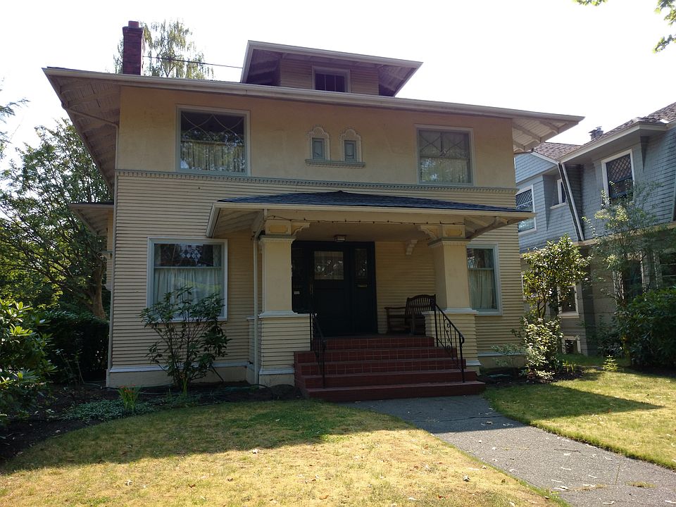 This turnkey,1904 Foursquare is a gracious classic. Through the rocking-chair front porch, the home opens to a grand entry of boxed beam ceilings,maho