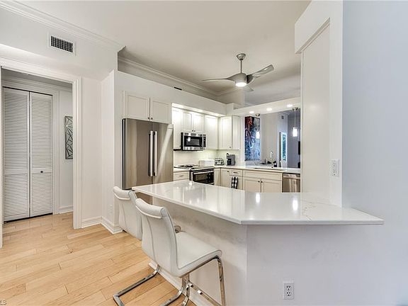 Welcome to this stunning 2 bedroom + den, 2 bathroom condo in the highly sought-after Breakwater at Pelican Bay. Fully updated with modern finishes, this condo features crown molding throughout, an open floorplan, and telescoping glass doors that seamlessly connect the main living area to the screened-in lanai, perfect for indoor-outdoor living. Enjoy a stunning lake view enhanced by serene water features, creating a tranquil ambiance to perfectly set the mood. Indoors, the kitchen boasts white shaker cabinets, quartz countertops, high end, barely used stainless steel appliances, and a convenient breakfast bar. The primary bedroom offers his-and-hers walk-in closets, private access to the lanai, and an ensuite bathroom with dual sinks and an oversized glass-enclosed shower. The versatile den provides the ideal space for an office, media room, library, or additional guest accommodations. Located in one of Naples’ most coveted beachside communities, Pelican Bay offers resort-style living at its finest. Residents enjoy nearly three miles of private white-sand beaches with lounge chairs, cabanas, umbrellas, and beachside dining. Additional amenities include tennis courts, a fitness center, spa services, canoeing, kayaking, biking and walking trails, and a vibrant community center with a full calendar of social events and activities. Don’t miss this opportunity to experience the best of Naples living in this beautiful condo!