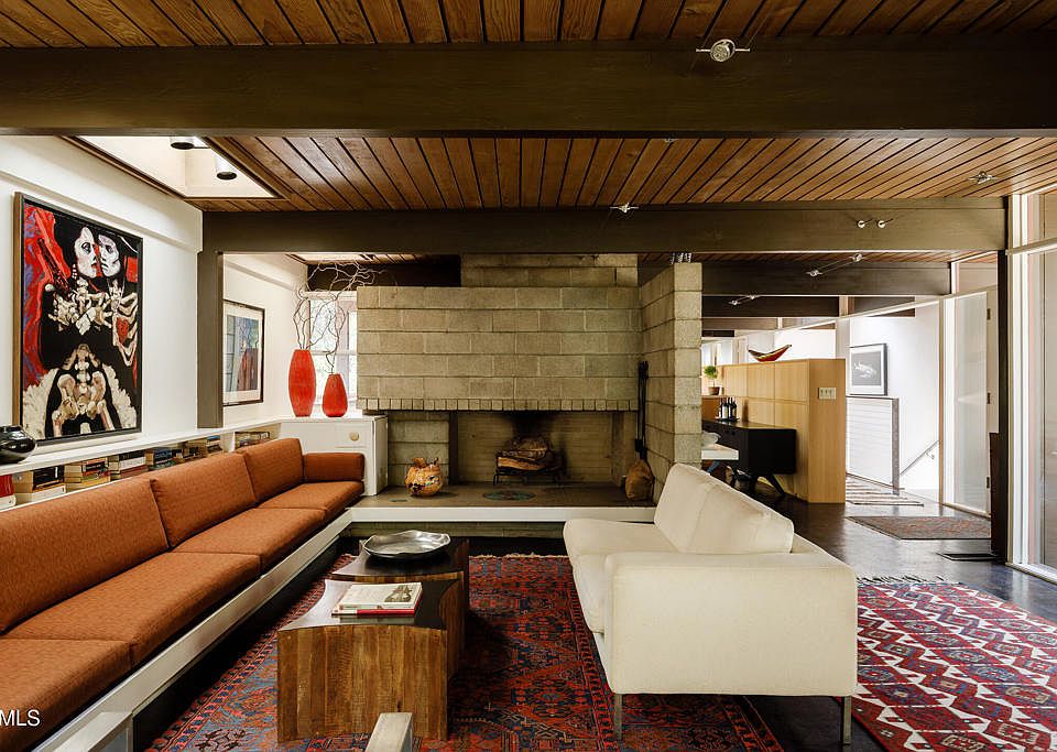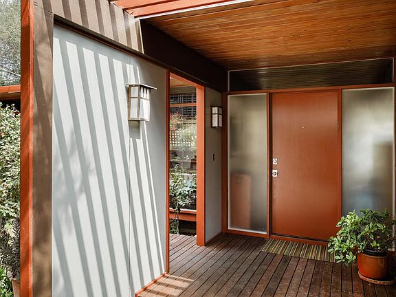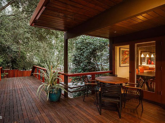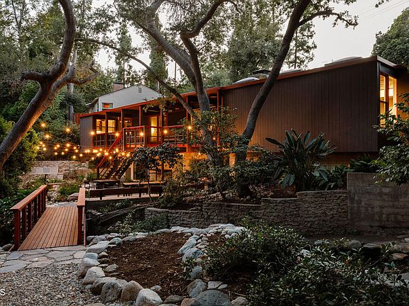 A Southwest Pasadena masterwork of Post & Beam Modernism, designed by Buff, Straub & Hensman, FAIA - nestled from view within a cluster of trees and uniquely sited to take advantage of the natural 'small suburban stream' that gently meanders through the property.Originally built in 1954, the architectural triumph is achieved through the simplicity of its rectangular programmatic design and restrained compilation of concrete, douglas fir and walls of glass. Extensive balconies, terracing, bridges and staircases connect one to the many layers of the pastoral outdoors - including entertaining decks, patios, vegetable beds, pathways, cascading ponds and conversational firepit.Center mounted front door vestibule allows one to seamlessly access both the public and private spaces of the residence. The living room features cork flooring, a low-slung built-in bench with adjacent seating, anchored by a wide-hearth rough concrete block fireplace that separates the living room from the remodeled kitchen featuring new cabinets, quartz countertops, floors and Miele appliances - all while preserving the original tile backsplash. Abundant storage is cleverly disguised as a pony wall that separates the kitchen from the primary corridor.Spacious primary bedroom, with separate adjacent office, direct patio access and added bathroom with single-piece concrete sink and countertop. Two additional bedrooms on the upper level, as well as a Jack and Jill bathroom 'garden' featured in a 1958 issue of Sunset Magazine with a flanking sink/lavatory, separated by a tiled sunken bath and shower - all overlooking a small Japanese garden.The lower level was developed and expanded to include bedroom, bathroom, laundry room, utilities and storage. Carport conveniently and discreetly positioned street side.See features document for upgraded systems. The property is listed on the National Register of Historic Places and has Mills Act status.