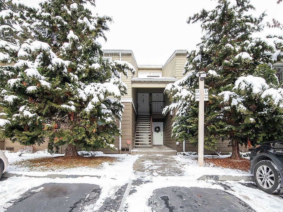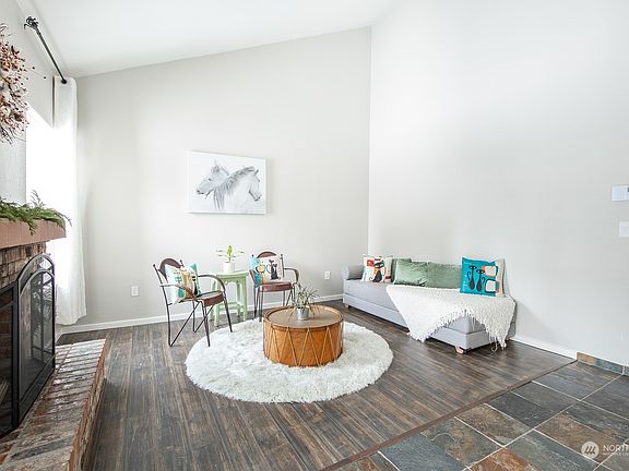 Brand new hardwood laminate floors and fresh paint welcome you in to this open concept top floor unit with sky high vaulted ceilings. Generous entry with full sized laundry on smart tile floor. Bright updated kitchen opens to dining room with walk out balcony overlooking lawn/tennis courts. Wood burning fireplace anchors the living room: space for an oversized sectional and books/ shelves/ entertainment. Down the hall, primary suite w/walk through closets and full bath, second spacious bedroom with double closets and a hall full bath. Huge closets, one spot off street parking. Swimming pool, club house, easy location close to employers, shopping & transit. Pre- inspected for your confidence: inspection available after showing. New Price!
