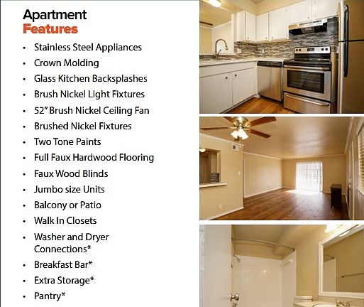 Stainless Steel Appliances !! Crown Molding !! Glass Kitchen Backsplashes !! Brush Nickel Light Fixtures New 52" Brush Nickel Ceiling Fan New Brushed Nickel Fixtures New Toilets New Light Fixtures Full Faux Hardwood Flooring Faux Wood Blinds Jumbo size Units Balcony or Patio Walk In Closets Washer and Dryer Connections* Breakfast Bar* Extra Storage* Pantry*