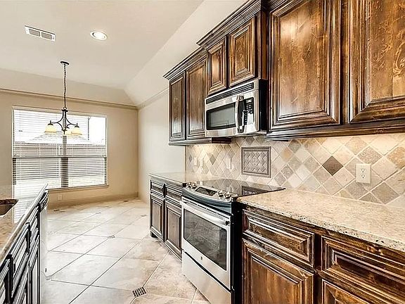 Open floor planGranite stainless steel appliancesTumbled stone backsplashHandcrafted custom cabinets