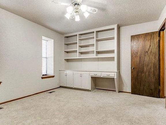 wood lined cathedral ceilings and large stone fireplace that will give you all the cozy cabin fees right here in Edmond. Up the stairs behind the fireplace is a loft style room - perfect for an office, reading nook or 4th bedroom + BONUS, it also has a balcony! Dining space is open to the kitchen and has sliding door to the covered patio and large back yard. Front bedroom has built-in desk and shelving, making it a great office or kids room. Master Shower has been updated also located in Highly Rated Edmond Schools