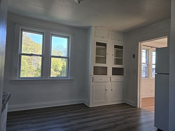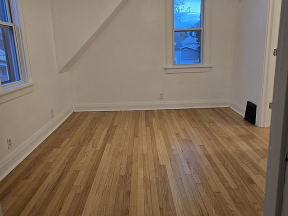 This two bedroom, one bath upper duplex unit sits at the end of a quiet cul-de-sac adjacent to a city-owned green space. The hardwood floors in the living room, dining room, and bedrooms have been recently refinished. The kitchen, with new vinyl flooring, comes with a refrigerator and electric stove. The upstairs tenants have access to the basement laundry hookups for a washer and gas dryer. Street parking is available. Downstairs tenants are responsible for lawn care and snow removal. The landlord pays for water and the tenants pay for gas, electric, and cable.
