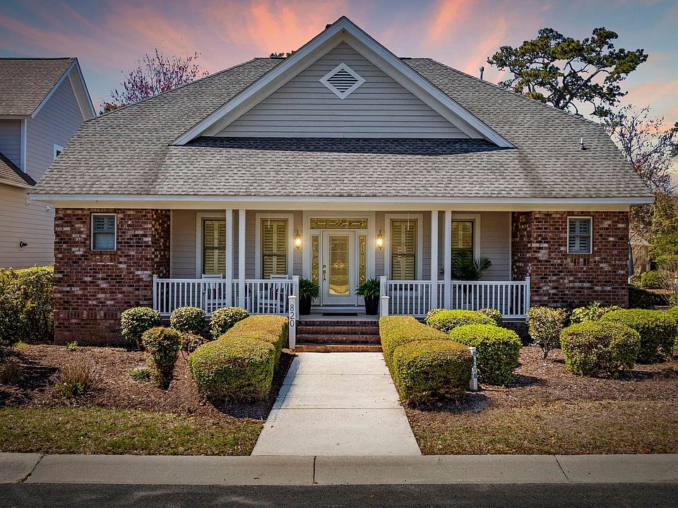 Welcome to 820 Morrall Drive, an exquisite residence located in the exclusive Bluffs at Tidewater Plantation—a highly sought-after gated golf course community in North Myrtle Beach, SC. Recognized as the top golf course in 2022, and new PGA ownership, this world-class community offers 24-hour security and a wealth of amenities. This stunning one-and-a-half-story home, situated on a quiet corner lot, is a rare find with its brick and cement board siding and a convenient side-loading garage. The inviting covered front porch, complete with rocking chairs, sets the stage for relaxed Southern living. Step inside to discover an elegant interior with 12-foot ceilings, extensive molding, and architectural columns. The spacious living area boasts abundant natural light, plantation shutters (installed in 2024), recessed lighting, and a cozy gas log fireplace. The well-appointed kitchen features upgraded cabinets with soft-close features, a new stainless steel refrigerator and five-burner gas stove (both installed in 2024), and a new garbage disposal (July 2023). The primary suite, which opens to the expansive back deck, offers a tranquil retreat, while the luxurious bathrooms showcase marble tile and high-end, high-rise toilets (upgraded in the past year). Additionally, the home includes three bedrooms, two full bathrooms, and an upper-level bonus/flex space with the potential for a future third bathroom. Ample storage, including floored attic space, enhances functionality. Thoughtfully designed for accessibility, the home features a ramp in the garage and wider doorways. Outdoors, enjoy the serene views of mature, wooded landscaping from the large back deck. The Bluffs at Tidewater Plantation community offers unparalleled amenities, including exclusive access to a private pool for Bluff residents, a private beach cabana with a kitchen, elevator, changing rooms, and private parking. The community also features five pools, fitness center, tennis courts, pickleball, a bocce ball court, a restaurant, and a vibrant social scene with a monthly newsletter and resident website. Owners receive discounted golf memberships and are just minutes from the beach. Don’t miss this exceptional opportunity to own a beautifully upgraded home in one of North Myrtle Beach’s most prestigious communities!