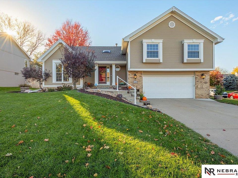 Welcome Home! The perfect Papillion home sits on a corner lot in one of Papillion's best neighborhoods! Custom gourmet kitchen with floor to ceiling windows, stainless appliances, pantry, roll out drawers, abundant custom cabinetry & Granite counters. Kitchen & dining areas open to souring Vaulted ceiling in living room with huge windows, engineered wood floors, brick fireplace and back yard views. 3 large bedrooms all with ceiling fans. Primary with frayed ceiling, 2 closets, beautiful primary bath with granite & tile and update main bathroom. New paint throughout & basement carpet. Nice landscaping, sprinkler system & great backyard with large composite deck & large shed. Close to the Schools, Parks, Shopping & Dining.