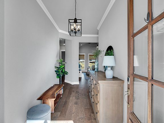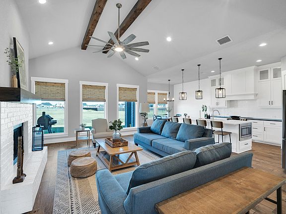 This stunning modern farmhouse by Elmwood Custom homes features 4 bedrooms, 3 bathrooms, an office with barn doors and sits on a spacious 1 acre lot-the perfect blend of style and function. Inside the open concept plan is ideal for entertaining. The living room boasts a vaulted ceiling with wood beams, recessed lighting and a cozy fireplace with a wood mantle and hearth. Notice the decorative casing around the windows and the seamless flow created by the wood flooring through the main areas. The kitchen is showstopper with granite countertops, stainless steel appliances, lighted display cabinets, pendant lighting, shiplap wall in the breakfast space and a spacious island, perfect for gatherings. The primary suite has character with a white brick wall facade. The relaxing bath retreat has separate vanities, a freestanding tub, a separate shower and a walk in closet. The split bedroom layout offers privacy and each bedroom includes ceiling fans. If you work from home, you will love the office with the sliding barn door. A mud bench is conveniently located near the 3 car, side entry garage and the laundry room. Out back relax or grill on your back covered patio. Don't miss your opportunity to own this beautiful home, Call for a showing today!