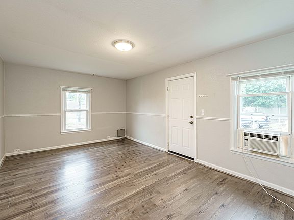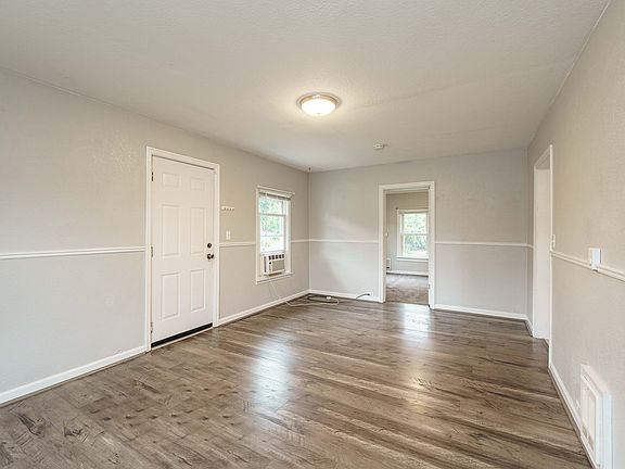 Living room has luxury vinyl plank flooring and a window air conditioning unit.