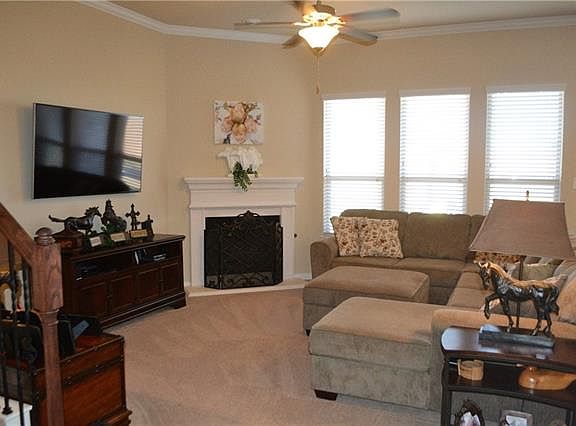 Nice curb appeal. Enjoy relaxing covered front porch. Artistic Glass front door. Extra width entrance; tastefully decorated w large ceramic tiles extending to living rm. 4 bedrooms; split Master in rear.Living Rm opens to Kitchen.Granite Breakfast Bar & Counter tops, SS Appliances, natural light flows between backsplash & granite tops. White stone fireplace & mantle is focal point in living room. Blinds on windows.Bonus Room up + half bath.