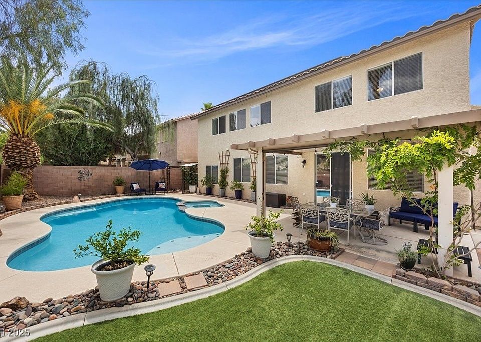Own a stunning pool home in Sunridge at MacDonald Ranch, one of Henderson’s most desirable neighborhoods. 5-bed + loft, 3-bath home w/ over 2,900 sq ft of versatile living, including a rare 9-ft deep private pool. Well-designed layout w/ formal living & dining areas, cozy family room w/ fireplace, & downstairs bedroom w/ ¾ bath. The heart of the home is the upgraded kitchen w/ a massive extended island, granite countertops, rich wood cabinetry, walk-in pantry, & newer appliances. Upstairs, you’ll find 4 bedrooms + a loft, including a spacious primary suite w/ room for a private retreat. Step outside to enjoy your private backyard oasis w/ no neighbors behind & entertain under the extended covered patio & relax by the pool. Additional upgrades include new A/C units, energy-efficient solar, smart security locks & water-saving landscaping. Located near top-rated schools, parks & minutes from shopping, dining, & freeway access. Homes w/ pools in this area are hard to come by at this price!
